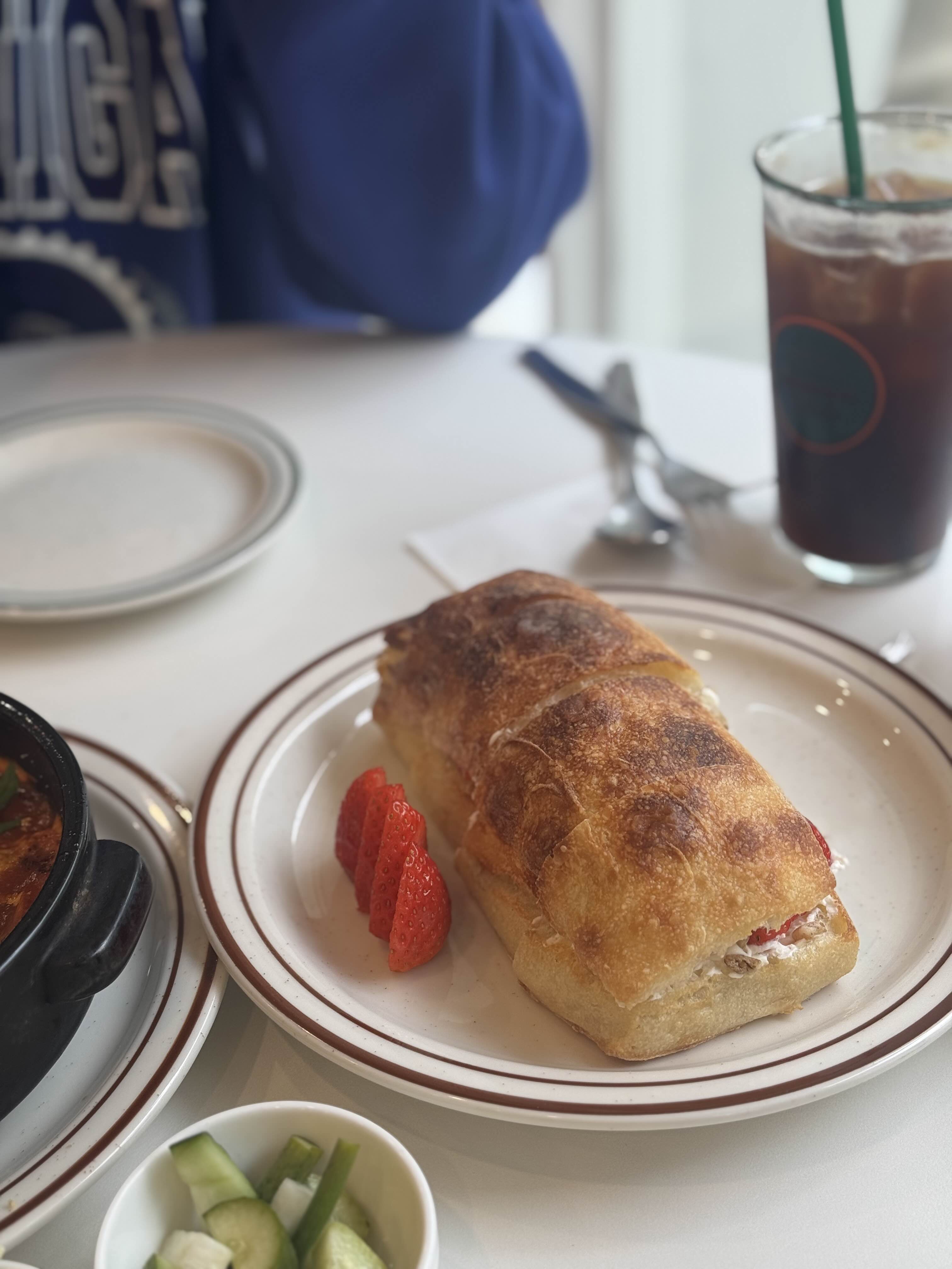 또 가버린 이유? 조용한 분위기 + 제철과일빵오늘은 친구랑 헬스장 갔다가 점심으로 어디 갈지 고민하다가, 자연스럽게 ‘브런치위치’가 떠올랐다. 3개월전 에도 이 친구랑 같이 갔던 곳인데, 분위기도 조용하고 여유로워서 참 좋았던 기억 때문이었다. 그리고 무엇보다 맛💕🍽️계절 과일 샌드위치, 이번엔 복숭아🍑처음 방문했을 땐 딸기 + 호두 + 크림 조합이었던 계절 샌드위치를 먹었었는데, 이번엔 복숭아, 피스타치오 크림, 크림치즈가 들어간 버전으로 바뀌어 있었다. 🍞🍑저번에 딸기 샌드위치가 너무 강렬해서 비교가 안 될 수밖에 없었지만 복숭아 조합도 꽤 괜찮았다.🍑생복숭아가 가득 들어가서 상큼했고,피스타치오 크림이 단짠이라 조화가 잘 어울렸다.저번 딸기 샌드위치가 워낙 감동이 커서 이번엔 비교가 됐지만..